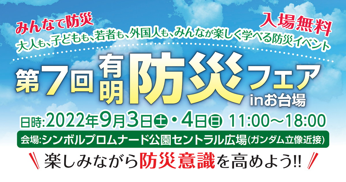 2022年9月3日(土)~4日(日)に、お台場のシンボルプロムナード公園 セントラル広場において、防災意識の啓蒙と災害時に頼りになる自衛官募集の協力のために「第7回有明防災フェア in お台場」を開催致します。