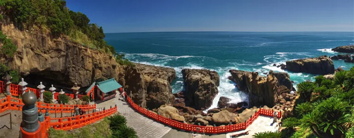 日向灘に面した絶壁に位置する「鵜戸神宮 (うどじんぐう) 」は、有名なパワースポットの一つとしても知られています。名物のひとつが運試しの「運玉投げ」で、見事成功すると願いが叶うといわれています。