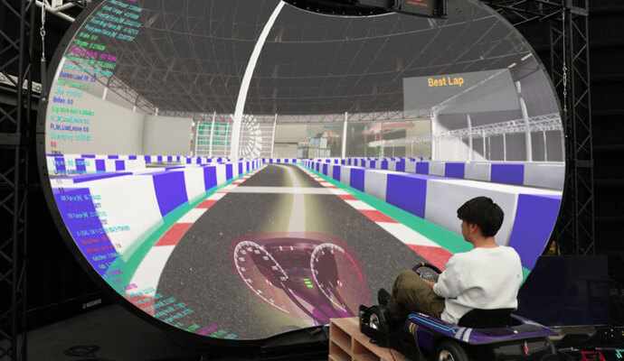 In the Kart Simulator, participants can experience driving on a course that faithfully recreates the path of the EV Mini Kart on a large dome screen. With the EV Mini Kart, projection mapping will display the real-time position data from the Kart Simulator onto the course.◆Event Outline
