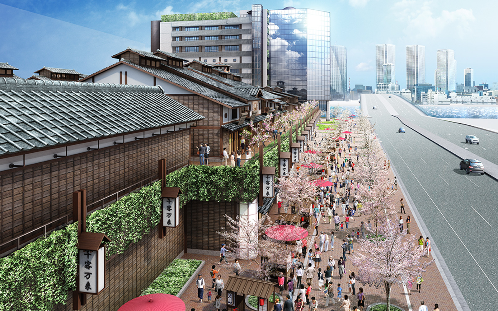 Toyosu Senkyaku Banrai, which will be adjacent to Toyosu Market, will be made up of Toyosu Edo – mae Market, a commercial wing, and Tokyo Toyosu Manyo Club, a bathhouse wing.Toyosu Edo – mae Market, the commercial wing will take over Chikuji’s traditions and unfold shops that sell goods and food and drink that use fresh ingredients distinctive of Toyosu. Please enjoy an eating tour and shopping in an open-air mall that will recreate the old townscape of Edo.