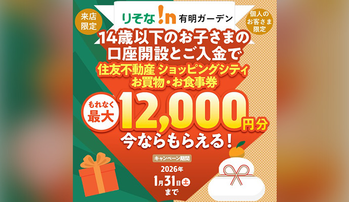・本キャンペーンは、りそな!nイオンモール大和郡山、りそな!n深川ギャザリアレガーレ、りそな!nセブンパークアリオ柏、りそな!n有明ガーデン独自で実施しているもので、他店ではご提供いたしかねますので、ご了承ください