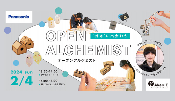 OPEN ALCHEMISTでは、ものづくりを体験できるプログラムやAkeruEで活動するクリエイターに関連するイベントを開催しています。今回のOPEN ALCHEMISTは以下のプログラムを行います。