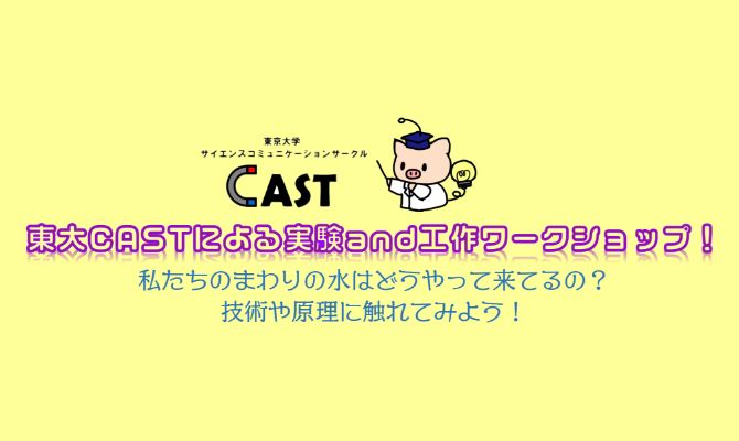 メディアやイベントに多数出演経験のある、現役大学生サークル「東大CAST」を講師に迎え、中学生・高校生、または中学生・高校生を含む家族を対象に、水の実験や顕微鏡の工作を通して下水道や身の回りの生活について考え、学びます!ぜひご参加下さい!!