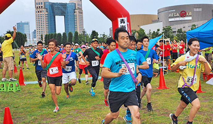 ダイバシティお台場の真ん中を走ります。人気の駅伝、笑顔のファミリーランを楽しみましょう。