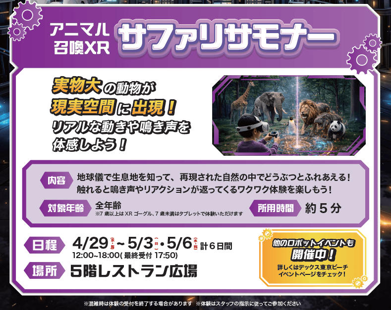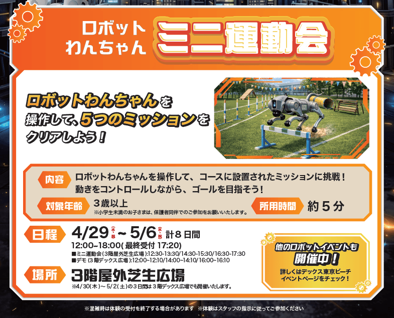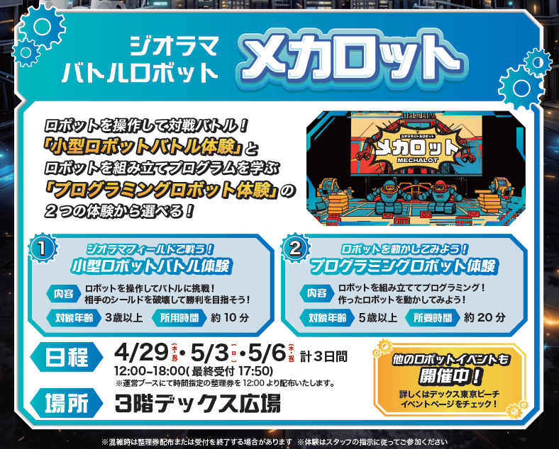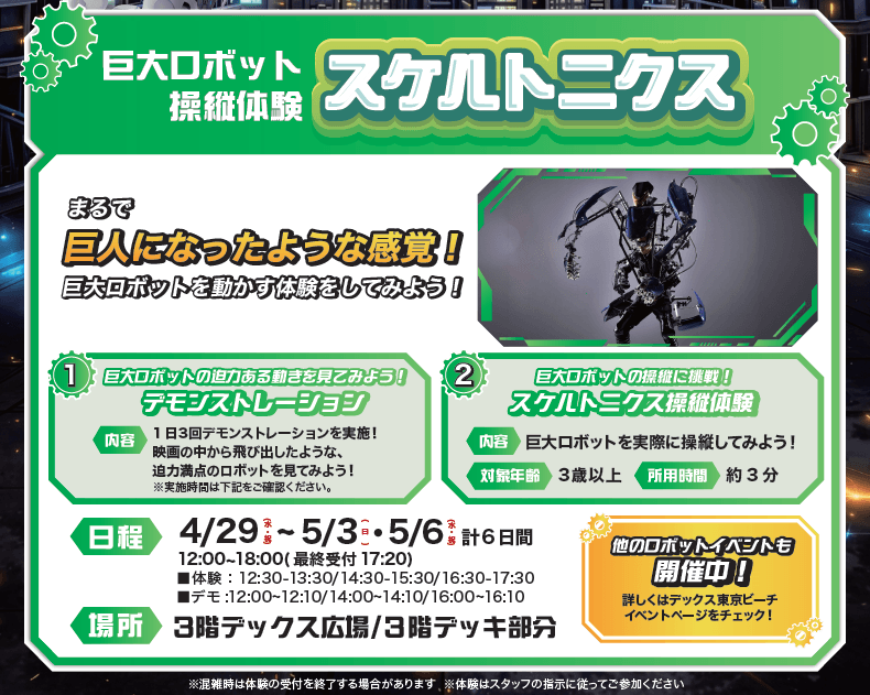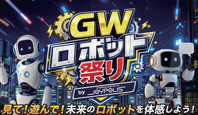 学ぶ・体験 遊び・エンタメ GWロボット祭り <デックス東京ビーチ> 2026-04-29 ~ 2026-05-06 台場エリア デックス東京ビーチでは、ゴールデンウィークを盛り上げる限定特別イベントを開催します。 他にも、ゴールデンウィークイベントを開催します !! ぜひ遊びに来てね★ ⇒ 5月4日・5日の撮影会情報を見る イベント情報 開催期間 2026-04-29 ~ 2026-05-06 開催場所 デックス東京ビーチ ウェブサイト https://www.odaiba-decks.com/event/detail/100?publish_begin=26-04-24&publish_end=26-05-06&hold_calendar=26-04-29~26-05-06