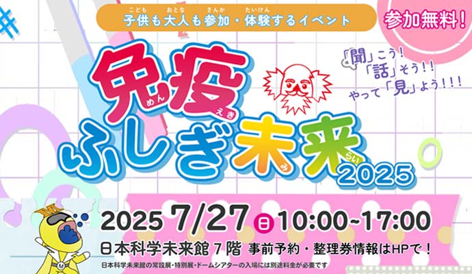 今年は『「聞」こう!「話」そう!! やって「見」よう!!!』をキャッチフレーズに、2025年7月27日(日)は東京お台場・日本科学未来館で、8月3日(日)はオンラインで、二日間にわたり「免疫ふしぎ未来2025」を開催します。