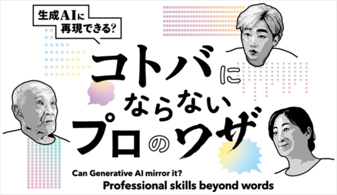 本企画では、詩人の谷川俊太郎さん、お笑いコンビ・スピードワゴンの小沢一敬さん、子育て経験をもとにした著書のある大場美鈴さんの3人の言葉のプロたちに、社会的な関心が高まっている生成AI(チャットGPT)を活用して、言葉にならない自らの暗黙知、プロの“ワザ”の再現に挑戦してもらいました。その様子をオリジナル動画として会場で公開します。