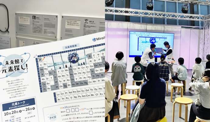 未来館の展示を見ながら元素を探したり、元素が大好きな科学コミュニケーターたちのトークを聞いたりして、少しだけ元素に詳しくなってみませんか?