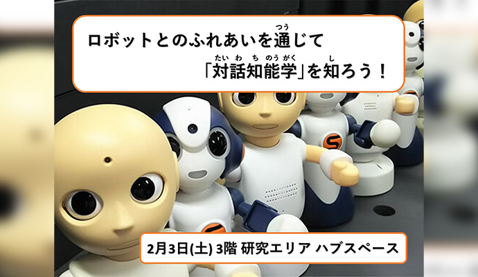このイベントでは、ロボットとのふれあいや研究紹介を通じてみなさんに「対話知能学」のことを知ってもらいたいと思います。