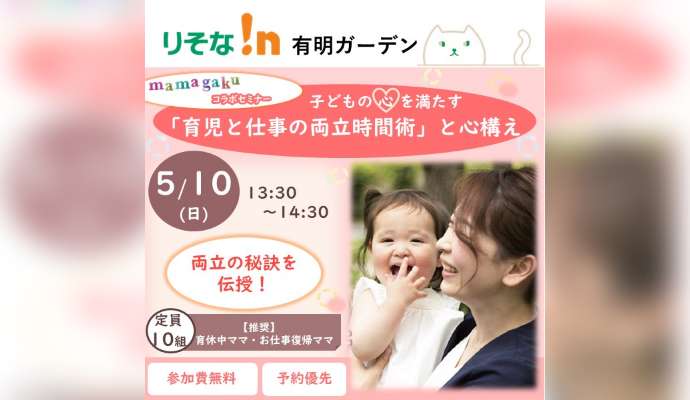 当セミナーでは、以下のような家事と育児の両立に役立つ情報を、盛りだくさんでお届けします。※セミナーは保護者さまのみのご参加を推奨しています。