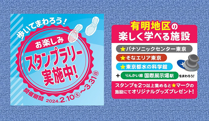 パナソニックセンター東京では、有明地区の近隣施設「東京都水の科学館」、「そなエリア東京」と、「りんかい線国際展示場駅」と合同で、「歩いてまわろう!お楽しみスタンプラリー」を開催いたします。