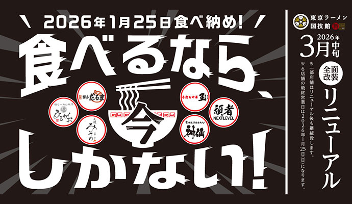 リニューアルオープンに向けた一時休業前に、入替予定の4店舗をはじめとする現在の「東京ラーメン国技館 舞」をお楽しみいただけるのは、2026年1月25日(日)までとなります。