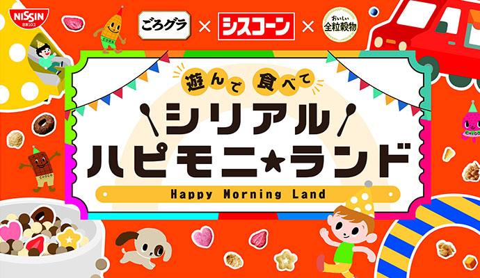 子どもたちの健やかな成長につながるよう、子どもたちが自ら進んで朝ごはんを食べたくなる、「朝ごはんが楽しみになるきっかけ」を届けるべく、日清シスコは喫食イベント「遊んで 食べて、シリアル ハピモニ★ランド」を開催します。