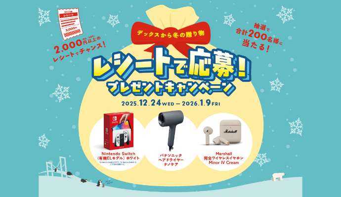 館内 (応募箱・記入台) に設置の応募用紙に、デックス東京ビーチで期間中にお買い上げのレシート2,000円以上 (税込・合算可) を貼付し、必要事項をご記入のうえ、応募箱へ投函ください。※レシート有効期間は2025年12月24日(水) ~ 2026年1月9日(金)の応募投函時間まで。※当施設以外のレシートは対象外となります(一部催事やレシートがでない店舗は対象外)。※景品は選べません。※各エンタメ施設のチケット類でのご参加方法につきましては、下記の詳細データ、応募箱・記入台に設置のPOPでご確認ください。※厳正なる抽選のうえ、ご当選者への賞品発送をもって発表にかえさせていただきます。賞品のお届けは2026年1月末から2月初旬を予定しています。※記入に不備がある場合は無効となります。※お預かりした個人情報は、賞品の抽選・発送のみに使用し、業務委託先以外の第三者には一切開示しません。※応募箱へ投函後のレシートのご返却はできませんので、駐車サービスをご希望の方やレシートが必要な方はお気を付けください。 - 賞品