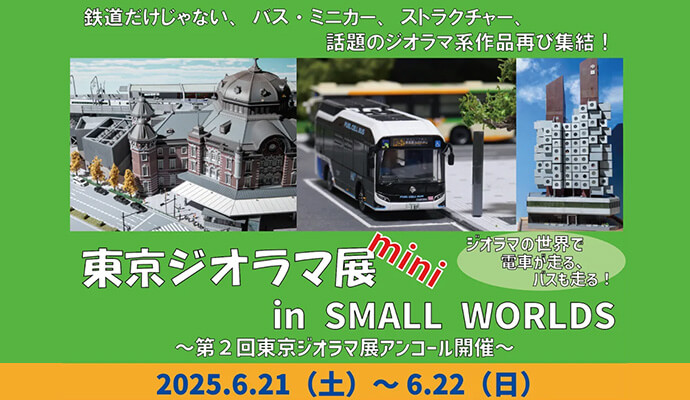 1/150スケール・1/80スケールといった鉄道模型の縮尺でありながら、ミニカーやトラック・バス、そしてビル等の建築模型、目線を下げると実景と見間違えるような写実性の高い完成度のジオラマ作品を中心とする「鉄道車両」以外の要素にもスポットを置いた模型・ジオラマ作品の展示会イベントです。