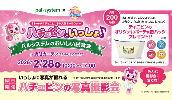 当日会場でパルシステムにご加入いただいた方には、もれなくティニピンのオリジナルポーチ&缶バッジをプレゼント!※缶バッジはランダムで4つの中から1つプレゼントとなります
