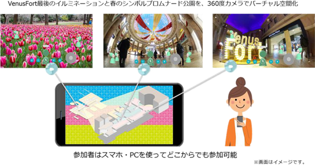 『お台場バーチャルフェスティバル VenusFort最後のイルミネーションと春のプロムナード公園を360度配信!』コロナ後を見据えた臨海副都心への来訪意欲の増進につなげるサービス・技術検証のため、バーチャル空間で臨海副都心エリアの一部を再現し、現地イベントの参加体験を実施します。