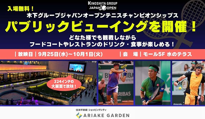 有明コロシアム、有明テニスの森公園にて開催される「木下グループジャパンオープンテニスチャンピオンシップス」のパブリックビューイングを開催します!
