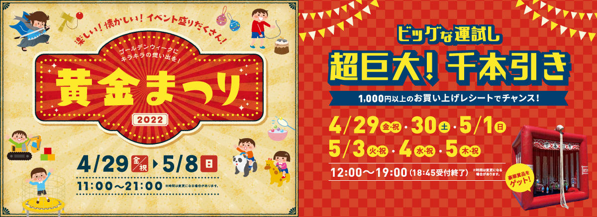 ゴールデンウィーク期間中の2022年4月29日(金・祝)~5月8日(日)に、「デックス 黄金まつり2022」や「超巨大!千本引き」といったお楽しみイベントを開催します。