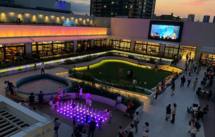 有明ガーデンの商業棟5F「水のテラス」において、15分間隔でオリジナルアニメーションと連動した「光と音の噴水ショー」を実施しています。