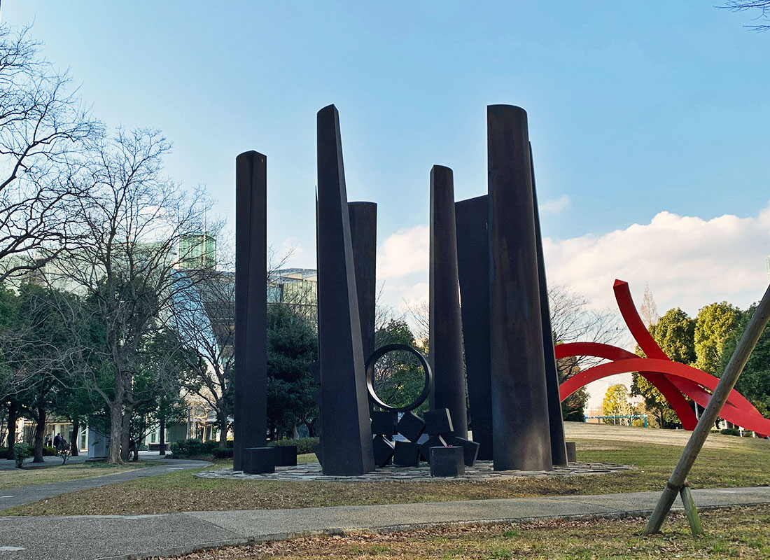 ウエストプロムナード公園内のテレコムセンター駅側に設置された野外彫刻。大木の木立の中に入り込んだような錯覚や、鎮守の森に迷い込んだ神聖な空気、ブラックホールの入口のような感覚を覚えます。