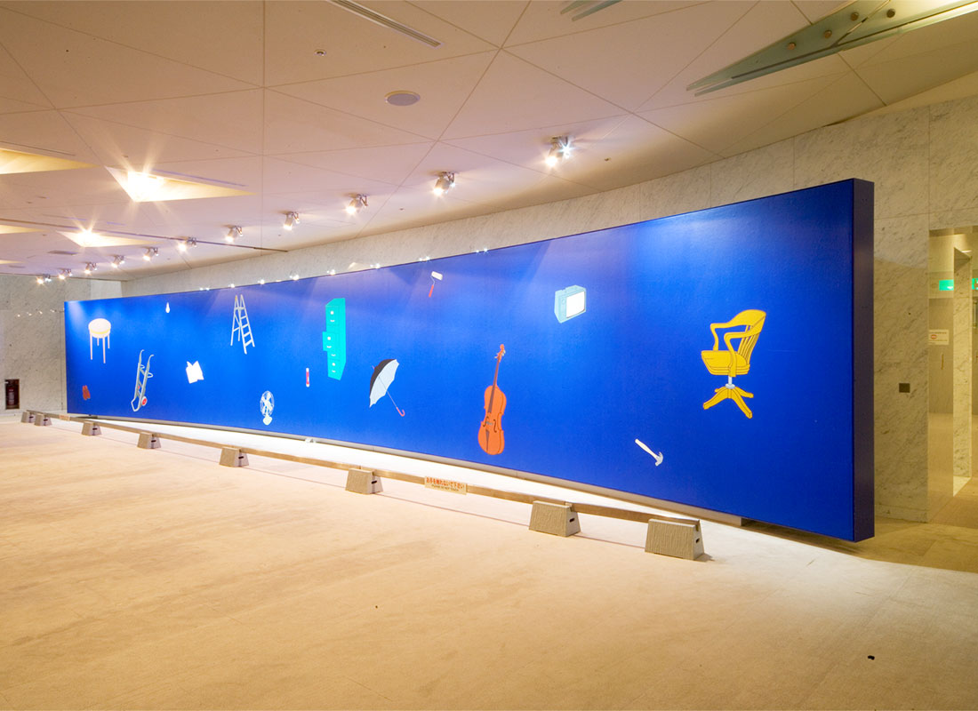 レセプションホール・ホワイエの壁面に飾られたこの作品は、英国の作家マイケル・クレイグ=マーティン氏の作品。長い曲線状の支柱なしの壁面に描かれており、濃いブルーの空間に傘やバイオリンなど実物大の15個の物体が、空間に浮かんだり立っているようにみえます。