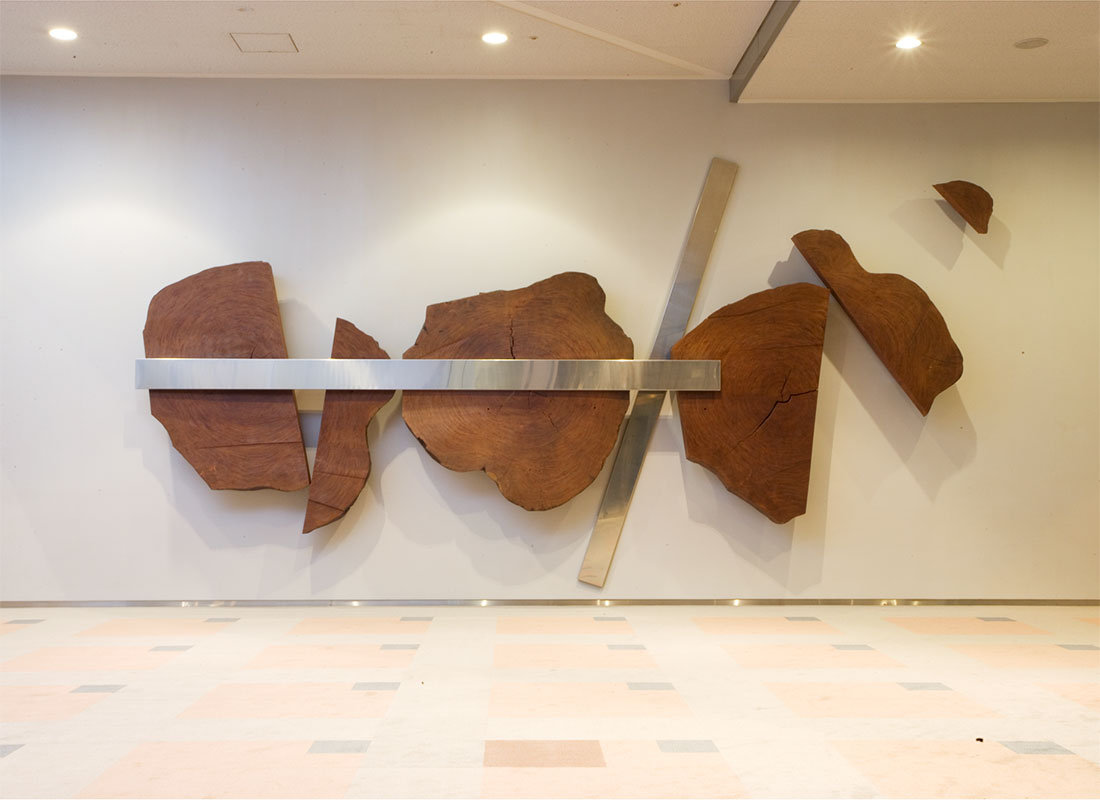 会議棟7Fロビーに日本の前衛抽象の先駆者・斎藤義重氏の作品が設置されています。素材はマホガニーとブビンガーという年輪を幾年も重ねた巨大な木材。この重厚な素材が軽やかに、またダイナミックなリズムを持って、広い壁面に大きな空間に静止するように設置されています。