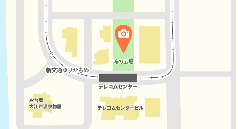滝の広場に着きましたら、噴水越しにテレコムセンターが見える位置に移動しましょう。そこが今回の撮影ポイントとなります。