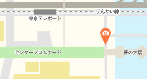 今回撮影するエリア東京テレポート駅から出口Aに進みます。そこから夢の広場のほうに向かい、有明方面にしばらく進みますと今回の撮影スポットとなる夢の大橋に到着致します。今回は橋そのものをしっかり写すため、橋から横に離れた水の公園広場から撮影します。東京テレポート駅より徒歩3分