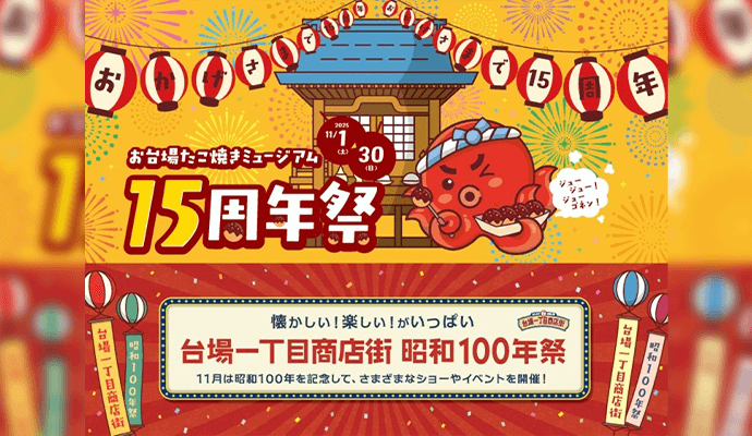 为纪念“台场章鱼烧博物馆”今年迎来开业15周年,怀着对客人的感谢之情,举办了“台场章鱼烧博物馆15周年祭”。另外,由于今年是2025年,所以在同一楼层同时举办“台场一丁目商店街2025年祭”。