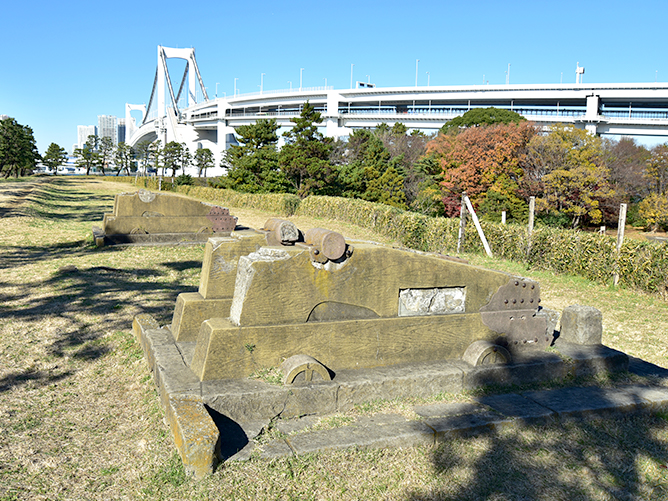 公园内有可以感受到当时风貌的阵屋和火药库的遗址,以及仿造的炮台等,在可以感受到江户时代的风貌的同时,还可以近距离观赏”彩虹大橋”。